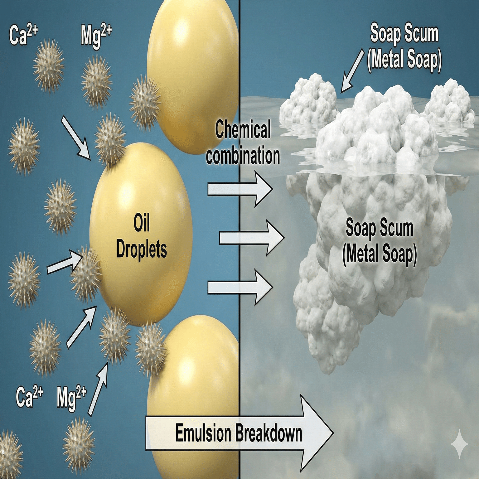 水の中に含まれるカルシウム(Ca)やマグネシウム(Mg)の量を表すのが「硬度」です。 これらが多い水(硬水)を使うと、切削油の中の脂肪酸(油分)と結合し、「金属石鹸(スカム)」という白いカスを生成します。