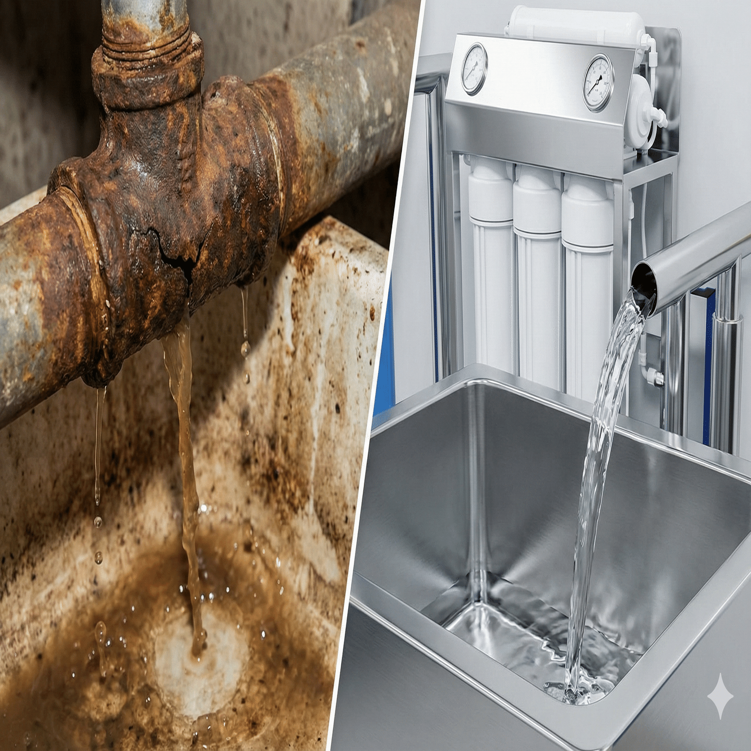 デメリット: あくまで「工業用」なので、飲めるレベルの清浄度はない。配管が古く、赤錆やゴミが混入していることが多い。